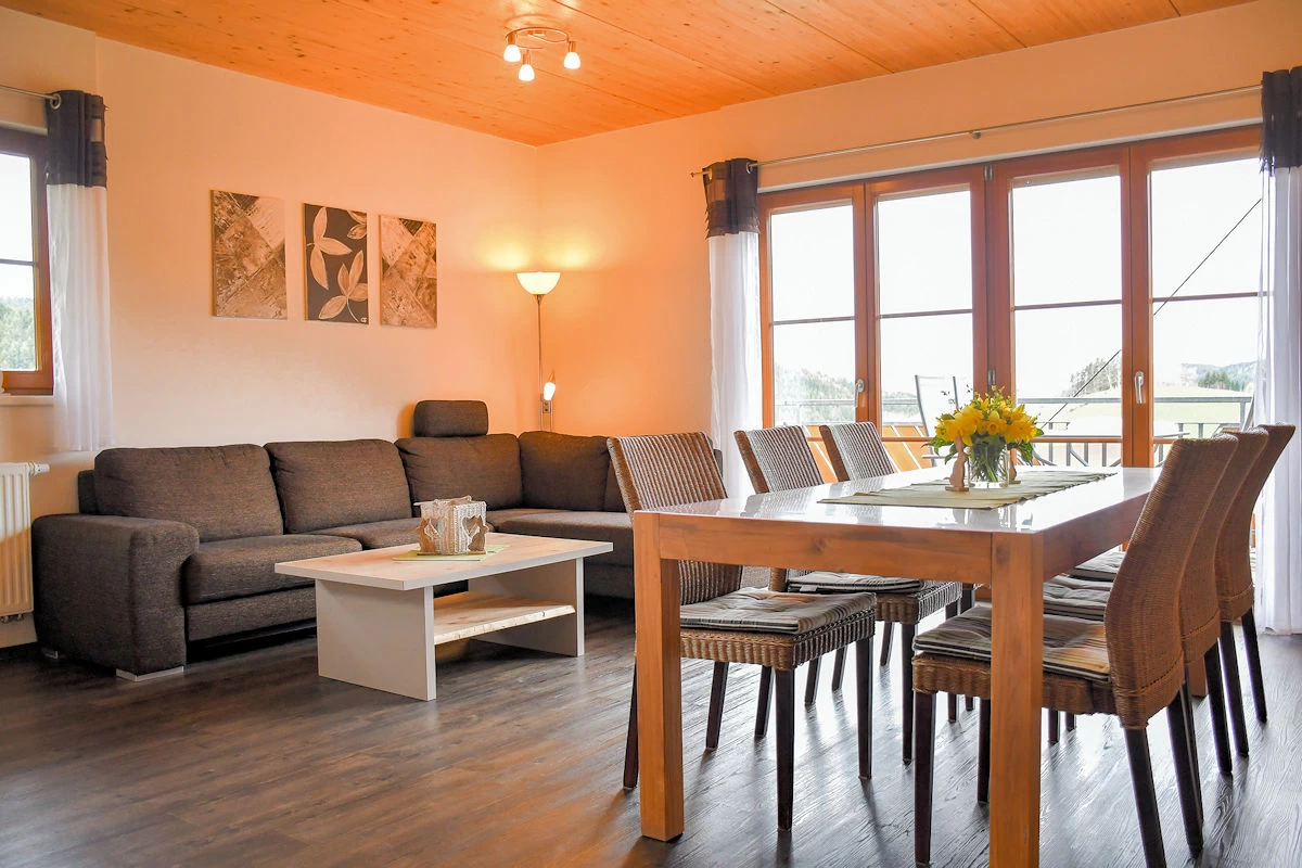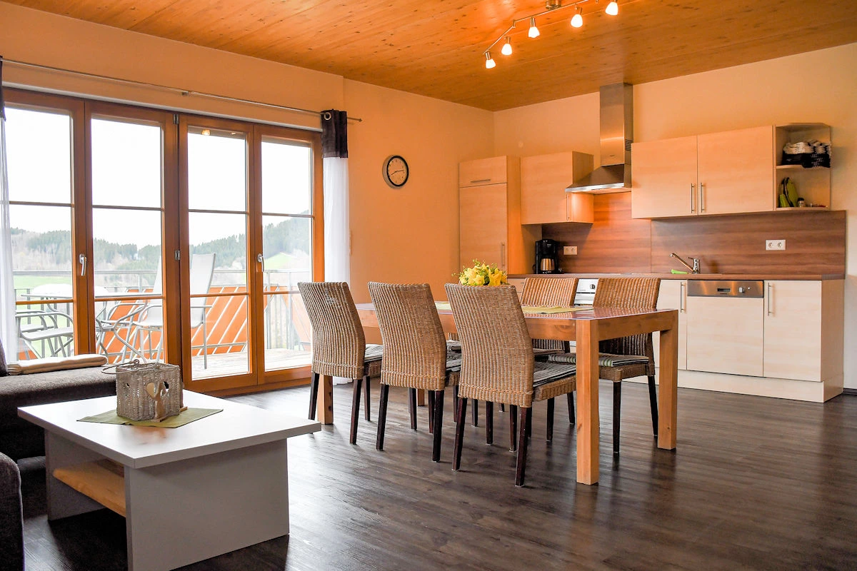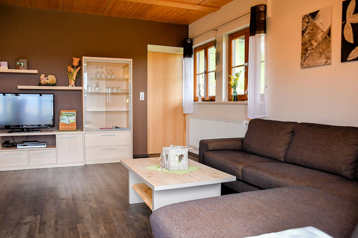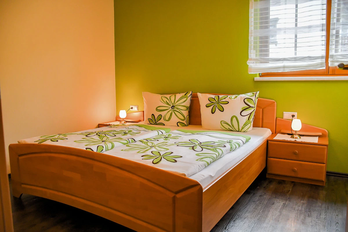 Die Ferienwohnung liegt im Erdgeschoß des Nebengebäudes (rechts neben dem Bauernhaus), erstreckt sich über 75 qm und bietet Platz für bis zu 4 Personen.